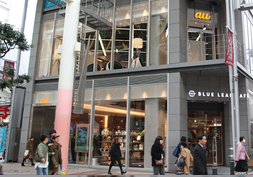 2016年12月28日、宮城県・仙台の商業地である一番町にオープンした「au SENDAI」は、KDDIの直営店で初めてカフェ「BLUE LEAF CAFE」を併設した。商店街に面した入り口で、カフェの店名と一緒に飾られているのは、店舗の構想が込められたロゴマークだ。
