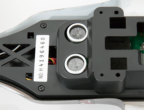超音波の送信部と受信部を分けることで、センサの反応速度が向上。地表から35cmという低空飛行を実現した。レースでは至近距離で機体同士が並んで飛行することもある。機体同士の干渉を避けるために、超音波を送信するタイミングをずらす工夫も。