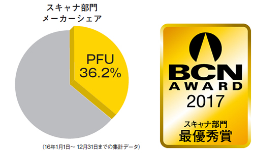 実売データを集計するBCNランキングで、スキャナ部門の年間販売台数No.1を、7年連続で獲得したPFU。主力製品である「ScanSnap」シリーズは、2016年に全世界への出荷台数が400万台を突破した。他の追随を許さず、長年の受賞を支えているのは、使い勝手のよさを追求した独自性の高い製品力だ。