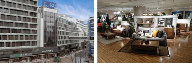 東武百貨店池袋本店の外観(左)と「ニトリ東武池袋店」の売場イメージ