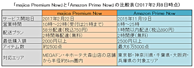 「majica Premium Now」と「Amazon Prime Now」の比較表