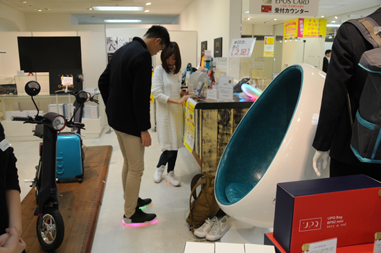 もちろん、昨年夏に発売して話題になったモバイル電動バイク「UPQ BIKE me01」も展示。タイミングよく2月5日にテレビの情報番組で紹介されたこともあり、「静岡から新幹線に乗って購入しにきてくださったお客様もいたほど。バイクは2月5日に完売して、すぐに追加生産を決定しました」とUPQの中澤社長も反響の大きさに驚いた。「バイクは税別で12万7000円もするので、さすがにネットで見るだけではなく、実際に触って確かめてから購入を決断するお客様が多い。UPQが扱う、これまでになかった新しいジャンルの製品だからこそ、リアル店舗での体感の重要性を感じる」と中澤CEOは店舗のメリットについて語る。