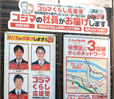 外部の協力会社ではなく、コジマの社員が直接顧客宅を訪問して商品の設置や説明などを行う「くらし応援便」。西東京市、広島市で昨年開始したサービスだが、今回の浮間舟渡への出店で提供エリアを板橋区内全域にも拡大する。区内既存2店のコジマとの連携で、最短30分の配達を実現した。シニア層の顧客が多い地域のため、訪問時の“御用聞き”による売り上げも期待できる。