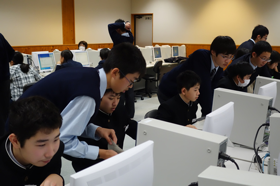 今年は、愛媛県松山市でもU-16プロコンが産声を上げた。運営の中心は、多くのIT系コンテスト全国大会で好成績を収め、強豪校として知られる松山工業高校メカトロ部顧問・山岸貴弘教諭と部員たちだ。昨年の夏休みに開かれたポリテクセンター愛媛(愛媛職業能力開発促進センター)の親子ものづくり体験教室で「プログラミング体験」のコーナーを設けて感触を確認。11月の文化祭でもプログラミング教室を開き、12月25日には、午前にプログラミング教室、午後にプログラミングコンテストというかたちで大会の開催にこぎ着けた。松山市で主に林業関連のシステムを手がけるマイクロシステムの松本統一郎社長が、大会の実行委員長として協力している。