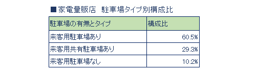 売場面積の平均は約2700m2。駐車場の有無とタイプで分類すると、郊外ロードサイドの独立型店舗が該当する「専用駐車場あり」は60.5%、複数の独立型店舗が一か所に立ち並び、駐車場を共有する方式の郊外ロードサイド店やショッピングモールなどが該当する「共有駐車場あり」は29.3%、「駐車場なし」は残り10.2%だった。