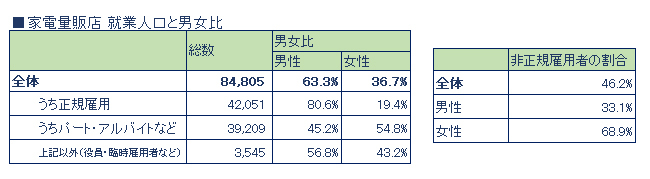 就業者は、おおまかに常用雇用、日雇いなどの臨時雇用、他社からの出向・派遣に分かれる。常用雇用のうち、正規雇用は約4万2000人(49.6%)、パート・アルバイトなどは約4万人(46.2%)。現状、家電量販店は、パート・アルバイトなどの非正規雇用の労働者が支えている。その数はかなり多く、フルタイム勤務で換算すると、従事する人数が1万2000人ほど減ってしまう。