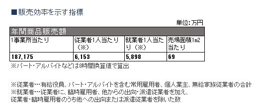 「商業統計」では、法人/個人事業主それぞれについて、正規雇用、非正規雇用、臨時雇用、他からの出向・派遣など、雇用形態別に細かく分類して集計しており、このうち、法人に限り、パート・アルバイトなどの勤務者を8時間労働に換算すると、雇用者数は約7万2000人となり、販売効率を示す指標の一つ、従業者一人あたりの年間売上金額は6153万円だった。