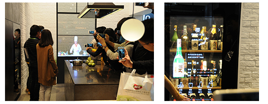 料理人が料理の作り方をサポートする「透明ディスプレイ」(左)と「SAKE&WINEセラー」