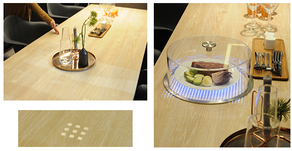 テーブルに料理が載った皿を置くと、光と音楽で演出する