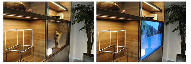 センサーを内蔵したテーブルに、出来上がった料理を置くと、照明が変わると同時に天井のスピーカーから音楽が流れ、棚の引戸に組み込まれた透明ディスプレイには、リラックスできる映像が流れる。普段は、棚の上に置いた置物を鑑賞して楽しみ、必要なときに映像が浮かび上がるという新しい空間の提案だ。