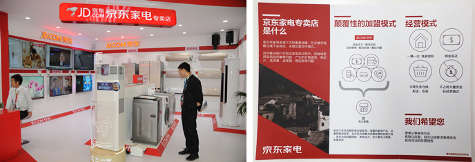 「京東家電」は、日本の街の家電店のような小規模店舗。加盟店の事業者を募集するパンフレットによると、ひとつの町に1店のテリトリー制を敷き、ドミナントで展開。加盟にあたり、物流費やロイヤルティが不要であることを謳っている。
