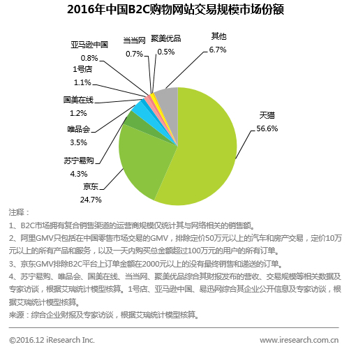中国の調査会社iResearchによると、2016年の中国EC市場のトップはアリババが展開する天猫(T-mall)でシェアは56.6%、JD.COMは24.7%で2位につける。