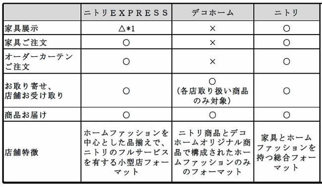 「ニトリ EXPRESS」は、ホームファッションを中心とした品揃えの小型店ながら、独立型店舗の大型店「ニトリ」と同じサービスを用意し、大型家具やオーダーカーテンの注文にも対応する、新しいタイプの店舗フォーマット。都心を中心に出店している、ホームファッションに特化した従来の小型店「ニトリ デコホーム」では行っていない製品の取り寄せ・店舗受け取りに対応し、一部の店舗では、家具も展示する。