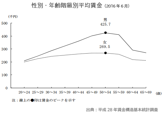 厚生労働省が2月に発表した「平成28年(2016年)賃金構造基本統計調査」によると、16年6月の平均賃金(時間外勤務手当、休日出勤手当などを含めない税込の給与額)は30万4000円(平均年齢42.2歳、平均勤続年数11.9年)、男性に限ると33万5200円(平均年齢43.0歳、平均勤続年数13.3年)、女性に限ると24万4600円(平均年齢40.7歳、平均勤続年数9.3年)で、賞与や残業手当などをプラスすると、男女あわせた平均年収は400万円台半ばと推測される。
