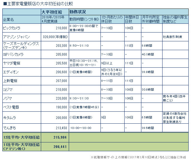 そこで、当サイトと連動する業界紙『BCN RETAIL REVIEW』の巻頭インタビューコーナー「Key Person」に登場した家電量販店を中心とした主要12社について、新卒就職情報サイト上で公開されている新卒初任給(15年・16年の4月度実績)を比較したところ、「インターネット関連業」に分類されるアマゾン ジャパンを除き、各社ともほぼ横並びで19万~22万円だった。