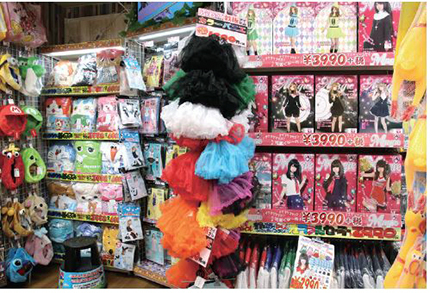 学生のパーティー需要を狙い、ドン・キホーテならではのパーティーグッズ、コスプレグッズの売り場を展開。特にコスプレグッズは、面積はそれほど広くないものの、バラエティ雑貨売り場に占める割合は他店よりも高いという。ビジネス向けに歓送迎会や新年会、忘年会での需要も見込まれる。