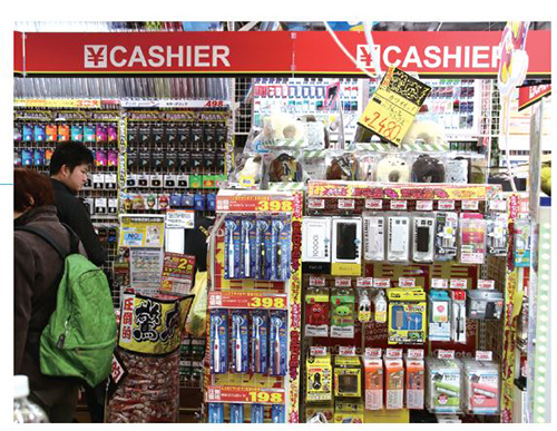 バイヤーが見つけた神保町店限定の掘り出し物は、段ボールや「驚安」POPに手書きで告知。所狭しと貼られたPOPで視線を誘う。さらに、充電器やカバーをはじめとしたスマホアクセサリを充実。価格を抑えた戦略商品と、品数の豊富さの両面で集客を図る。