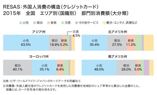 ただ、エリアごとの部門別消費額によると、中国を含むアジア州、北アメリカ州、南アメリカ州は、家電小売やデパートなどを合わせた「小売」の比率が最も高く、アジア州では全体の約6割を占める。一方、ヨーロッパ州は、「小売」より「宿泊施設」の比率のほうが高く、北アメリカ州も「小売」の比率は低めだ。