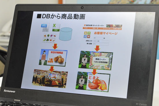 従来はPowerPointをベースにすることが前提だったが、新製品の「PIP-Maker for データベース」は、商品マスタベースに使用されることが多いデータベースやCSVに対応。膨大な品目数でも、フォーマットに沿って情報を入力しておけば、自動で要素を動画中に配置することができる。データはサーバー経由で読み込まれ、1時間で最大1000本の動画を生成することも可能だという。