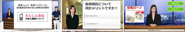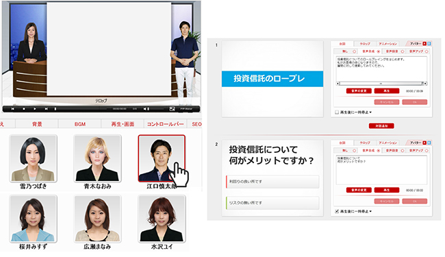こちらは、アバターを講師に見立てた「思考型」、顧客に見立てた「体験型」、提案側と顧客の2人のアバターによるかけ合いを再現する「共有型」などの動画生成が可能だ。
