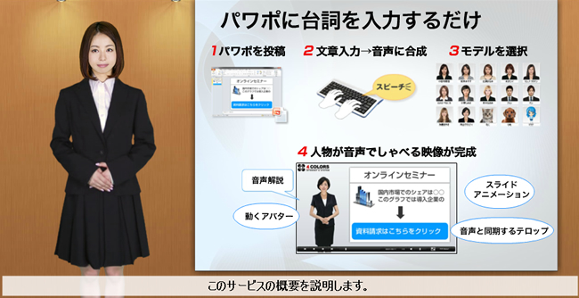 「PIP-Maker」は、「Microsoft PowerPoint」の資料をベースに、設定したアバターが動画のテキストを読み上げる動画制作サービス。資料情報に「人(アバター)」と「音声」を加えることで、リッチかつ表現力の豊かなPR動画や商品説明動画、eラーニングコンテンツを生成することができる。