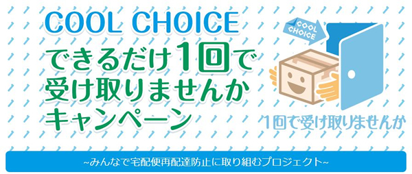 地球温暖化防止を目指す、山本環境大臣をチーム長とした「COOL CHOICE 推進チーム」のプロジェクトの一環。キャンペーンには、103の団体・企業が賛同し、経済産業省、国土交通省と連携しながら、インターネット通販の普及とともに社会問題となりつつある、宅配便の再配達問題の解決を目指す。
