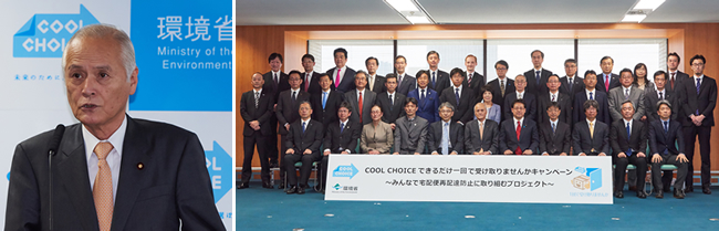 キックオフイベントで挨拶した山本環境大臣(左)と、賛同団体・企業の出席者