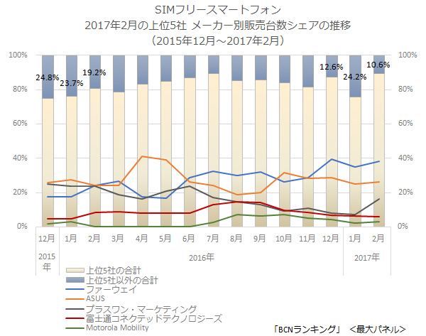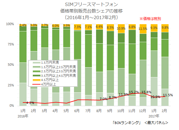 全体的に安いため、SIMフリースマホは、3万円台後半でも「高い」とみなされていた。「4万円以上」はハイエンドモデルの位置づけだ。もう少し高い「4万5000円以上」となると、該当する製品はごくわずかしかない。しかし、2016年10月以降、「4万円以上」の構成比が高まり、1割超を占めるようになった。SIMフリースマホ自体の販売台数が伸び、その中での比率が拡大しているにも関わらず、競合が少ないこの価格帯に目をつけたメーカーがある。