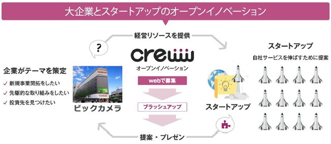 Crewwは、2017年3月現在、2700以上のスタートアップが登録している日本最大級のオープンイノベーションのプラットフォーム。ビックカメラは、スタートアップとの協業を通じ、これまでの枠組みを超えた新規事業の創出を目指す。
