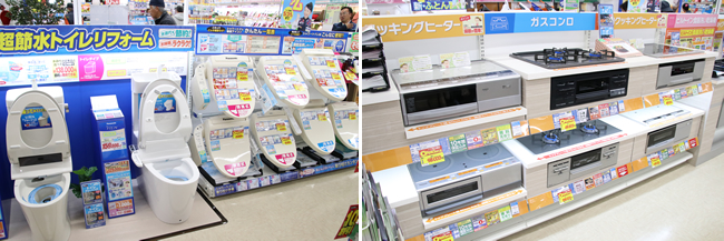 このほか、特に力を注ぐのは住宅設備事業。「キッチン・バスなどは見本ではなくカタログだけだが、トイレ、オール電化、太陽光発電など、家電業界の中でもエディオンが強みとする住宅設備事業を導入することで、“一軒”の付き合いをしていきたい」と都川英一店長は意気込む。