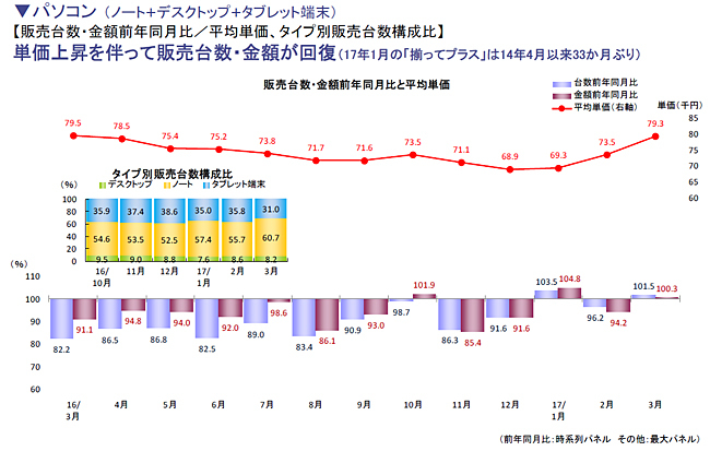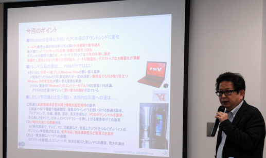 続けて、2016年3月から17年3月までの直近1年間と、07年1月以降の約10年に及ぶ長期間の月次データをもとに詳細を説明。PC全体の販売台数・金額や平均単価の推移、タイプごとのメーカー別シェアの変動などを示し、さまざまな角度から、国内のPC市場の現状を分析した。