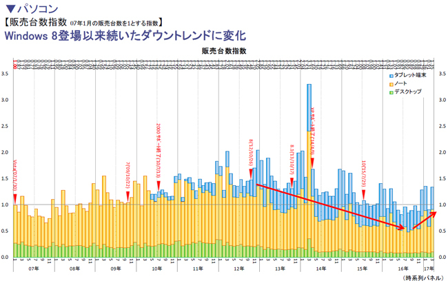 PC市場は、従来からのインターフェースを大幅に刷新した12年の「Windows 8」登場以降、ダウントレンドが続いていた。14年春に「Windows XP」のサポート終了と消費増税前の駆け込み購入が重なり、一時的に販売台数が大幅に跳ね上がったものの、その反動は大きく、ここ3年近くは過去にないほど売れ行きは低迷していた。