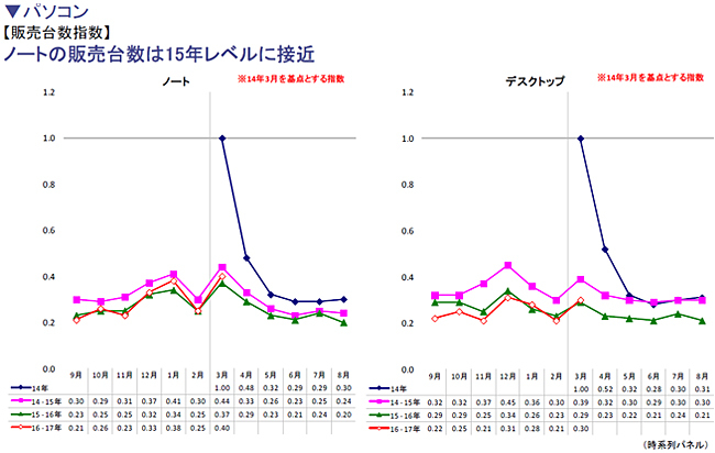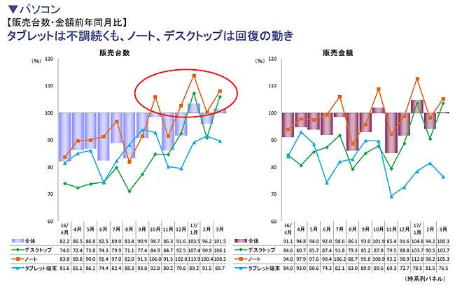 直近の3月は、ノートPCに加え、絶不調だったデスクトップPCも前年を上回り、ほぼ15年の水準に接近。最新OS「Windows 10」の安定化に加え、4月11日でサポートが終了した「Windows Vista」やスペックの低い「Windows 7」搭載機種からの買い替えが販売台数を底上げしているとの見方を示した。