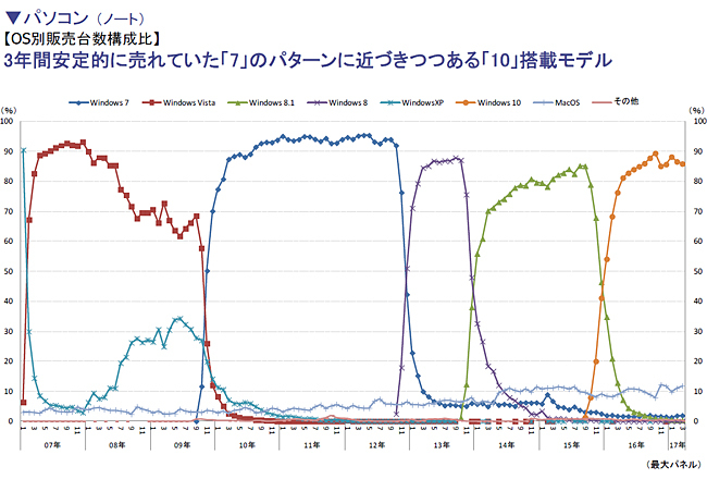さらに、07年1月から約10年間のノートPCのOS別販売台数構成比を示し、現行の「Windows 10」は、次バージョンのリリースまでの3年間、安定的に売れていた「Windows 7」のパターンに近づきつつあるとの見方を示した。PC販売の好不調は、OSの評価に左右されているともいえる。