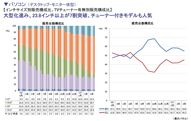 また、最近の傾向として、ノートPCは軽量化、デスクトップPCは、主流のディスプレイ一体型PCの大画面化とTVチューナー搭載率の高まりを挙げた。ゲームやテレビ試聴、動画・写真の鑑賞、プログラミング、長文の作成などのクリエイティブな用途なら、スマートフォンより、大画面のPCにアドバンテージがある。ディスプレイ一体型PCは、この1年で急速に大型化が進み、画面が「23.8インチ以上」の構成比は7割を突破。さらに、16年秋以降、より大きい「27インチ」の比率が高まり、直近の16年3月は15.5%を占めた。こうした大画面PCは、テレビの置き換えとして選ばれているとみる。