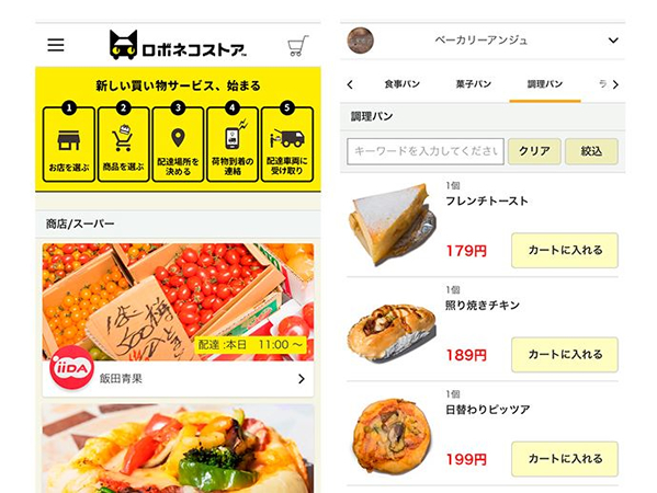 「ロボネコストア」は、対象店舗の異なる商品をインターネット上で一括購入し、自宅など指定した場所で受け取れる買物代行サービス。冷蔵・冷凍品にも対応し、荷物の到着予定時刻は、スマホからリアルタイムで確認できる。
