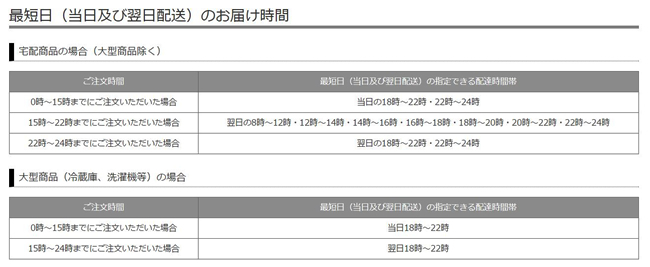 これまで当日配達は夜21時までだったが、顧客のニーズに応え、配達時間を延長した。指定可能な夜間の配達時間帯は「18時~22時」と「22時~24時」で、配達料は無料。冷蔵庫や洗濯機などの大型商品を除く「在庫あり商品」を、クレジットカード、代金引換配送、全額ポイントでの支払いで購入した場合のみ、指定できる。なお、大型商品は従来通り、夜間指定配達は「18時~22時」のみとなる。