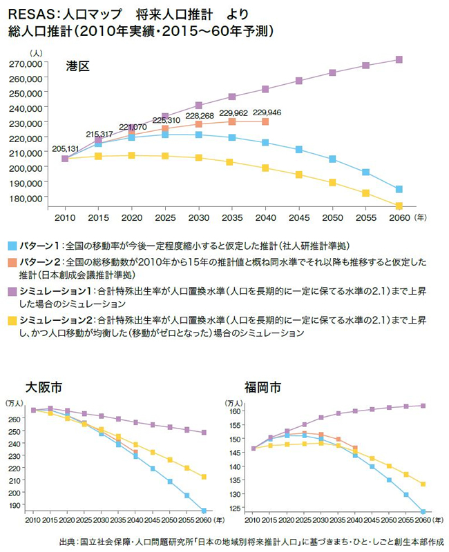 例えば、湾岸エリアや、田町・品川駅間に新たに開業する「品川新駅」周辺エリアの再開発が進む東京都港区は、最も現実的な予測と思われる「パターン2(全国の総移動数が2010年から15年の推計値と概ね同水準でそれ以降も推移すると仮定した推計)」の場合、35年まで人口は増加する。