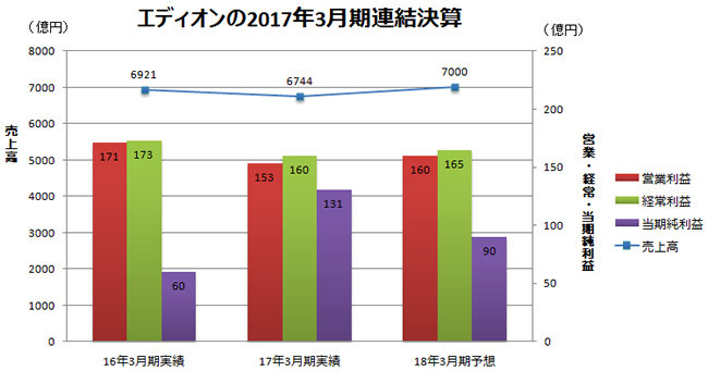 エディオンは5月9日、2017年3月期の連結決算を発表した。売上高は6744億2600万円(前年比97.4%)、営業利益は152億7300万円(89.6%)、経常利益は160億500万円(92.6%)、当期純利益は131億1800万円(217.8%)で、減収、営業・経常減益だった。18年3月期は再び売上高と利益を改善することを目指しており、業績予想は売上高7000億円、経常利益165億円としている。