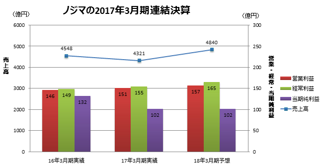 ノジマが5月10日に発表した2017年3月期の連結決算では、総務省の指針により過度な競争が抑制されたためスマートフォンなどのデバイス関連機器の販売が前年を下回ったものの、4Kテレビや洗濯機といった家電が堅調に推移し、売上高は約4320億円で前年比は約95%だった。