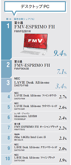 2017年3月のピックアップカテゴリは、「SIMフリースマートフォン」「ノートPC」「4Kテレビ」「外付けHDD」「デスクトップPC」「ヘッドセット」の6つ。「デスクトップPC」の1位は、富士通の「FMV-ESPRIMO FH」シリーズの「FMVF52B1W」でした。大学生向けとして位置づける、23.8型液晶ディスプレイを搭載した独特のスタンドが印象的なモニタ一体型モデルです。