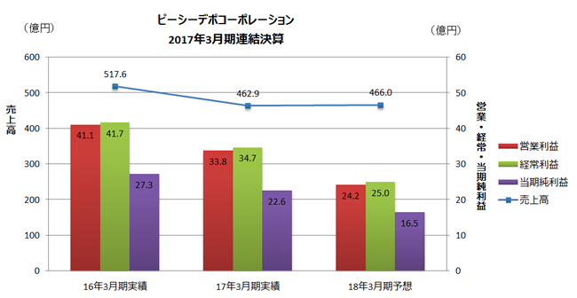 ピーシーデポコーポレーション(PCデポ)は5月15日、2017年3月期(16年4月~17年3月)の連結決算を発表した。昨年、高齢者に対する高額なサポート契約とその解約金をめぐって批判を浴びたことから業績は低迷、2ケタの減収減益となった。また11年3月期以降、商品自体とサポートを一体化して提供するサービス商品に関して事務処理に誤りがあったとして、過去7年間の決算の訂正を発表した。