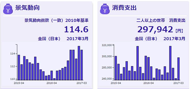 内閣府が5月10日に発表した今年3月の景気動向指数は、2010年を100として、先行指数:105.5、一致指数:114.6、遅行指数:117.7となり、「改善を示している」と判断した。12年12月から続く景気拡大は52か月(4年4か月)に達し、地価高騰や消費ブームが巻き起こった「バブル景気」の51か月の長さを超えた。