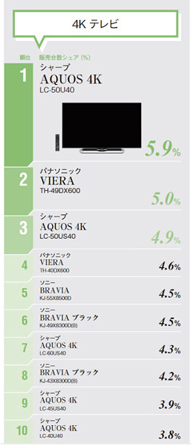 2017年4月のピックアップカテゴリは、「SIMフリースマートフォン」「ノートPC」「4Kテレビ」「レコーダー」「タブレット端末」「液晶ディスプレイ」の6つ。「4Kテレビ」の1位は、シャープの4K液晶テレビ「AQUOS 4K」の50型スタンダードモデル「LC-50U40」でした。4Kテレビ