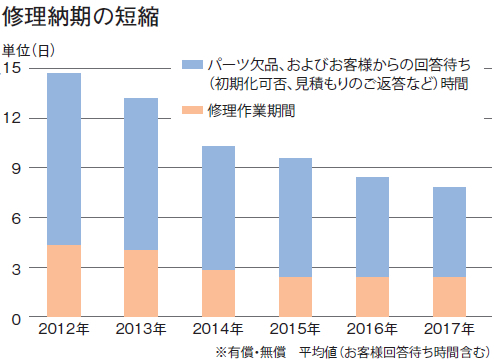下の表「修理納期の変化」を見れば、5年前との差は明らかだ。12年の修理品の平均預かり期間が14.7日だったのに対して、17年現在では7.8日(見込み)と、ユーザーの手元にパソコンがない期間を半分程度に短縮できた。