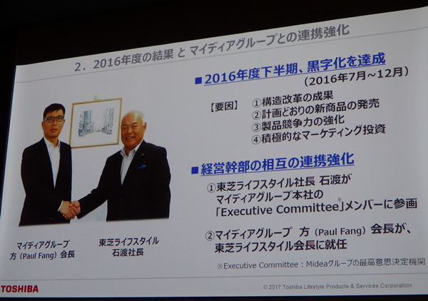 開発スピードのアップは、両社の経営幹部の連携強化による情報や事業戦略の共有も大きく関係しているという。17年1月には、石渡社長がマイディアグループの最高意思決定機関である「Executive Committee」メンバーに就任し、2月にはマイディアグループの方洪波(ファン ホンボ)会長が、東芝ライフスタイルの会長に就任した。