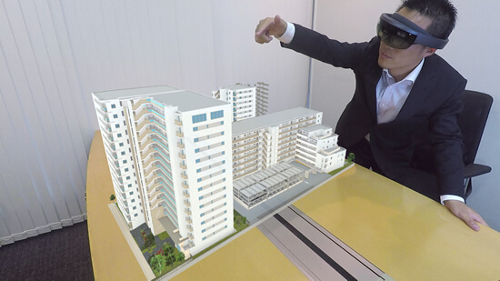 「HoloLens」はヘッドマウント型のホログラフィックコンピューターで、目の前の現実世界の中に、3Dの仮想物体である「ホログラフィック」を重ねて表示させることで、現実世界と仮想世界を複合させ、複合現実(Mixed Reality)を実現する新しいデバイス。「HoloLens」をかけると、現実空間に「ホログラフィックス」を重ねて表示させ、紙やWebといった2Dデータでは理解しにくかったマンションのビジュアルイメージを立体的にわかりやすく表現する。