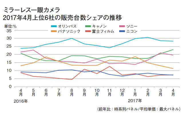 メーカー別では30%弱のシェアを維持し、オリンパスがトップ。4月は前年比127.7%と大きく伸びた。最も売れている製品は「OM-D E-M10 Mark II」だ。