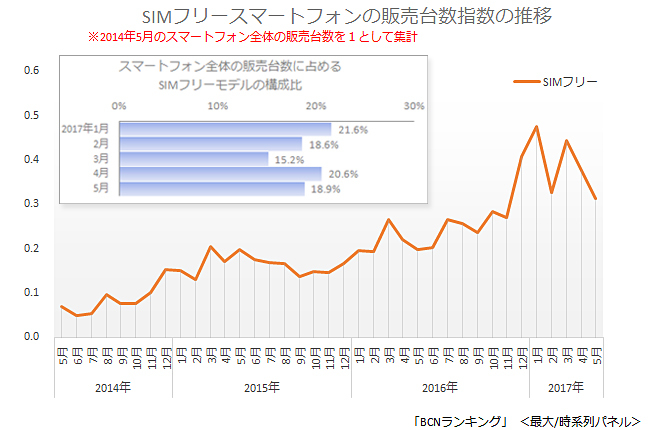 iPhoneや非SIMフリーのAndroidスマホを求める層は、最初からキャリアショップに向かい、家電量販店は購入先から外れているため、相対的に数字が高くなっているとしても、3年前、2014年7月の時点では、SIMフリーモデルは、スマホ全体のわずか5%に過ぎなかったことを考えると、2割を超えた今は、まさに普及期に入ったといえるだろう。