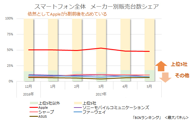 同時に、スマホ全体のメーカー勢力図も変わるだろう。ヒットを飛ばしたメーカーのシェアは高まり、出なかったメーカーのシェアは低下する。あたりまえの動きだが、ダントツのAppleを追う2番手は、ソニーモバイルコミュニケーションズ、シャープ、ファーウェイ、ASUSと、以前とは様変わりしている。このなかで、唯一、SIMフリー端末を手がけていないソニーモバイルの今後が気になるところだ。